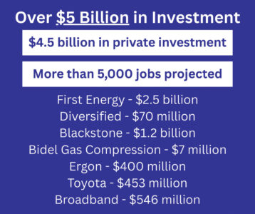 Other projects announced during Morrisey’s first year include the $7 million Bidell Gas Compression expansion in Weirton, the $400 million Ergon expansion project in Newell, and the $453 million Toyota Motor Manufacturing West Virginia expansion project in Putnam County.