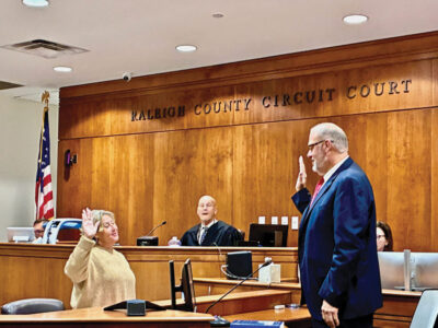 - West Virginia Board of Education President Paul Hardesty, right, is sworn in prior to giving testimony in October in a religious vaccine exemption lawsuit before Judge Michael Froble in Beckley. (File Photo)