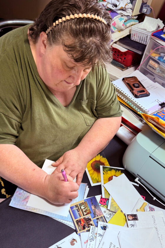 This August 2025 photo provided by Billy-Jo Dieter shows Dieter as she writes cards to strangers in Ellsworth, Maine. (Billy-Jo Dieter via AP)