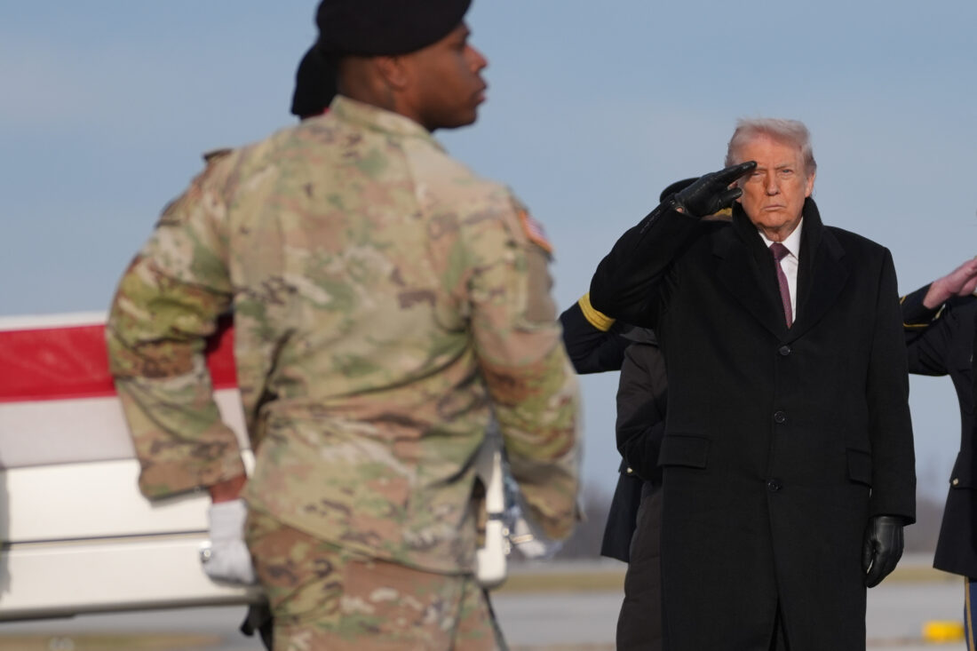 - President Donald Trump salutes as a Army carry team moves the flag-draped transfer case with the remains of Iowa National Guard soldier Sgt. Edgar Brian Torres-Tovar, 25, of Des Moines, Iowa, during a casualty return, Wednesday, Dec. 17, 2025, at Dover Air Force Base, Del. (AP Photo/Evan Vucci)