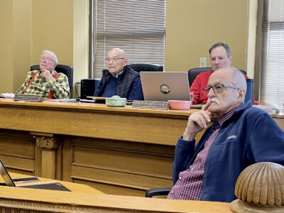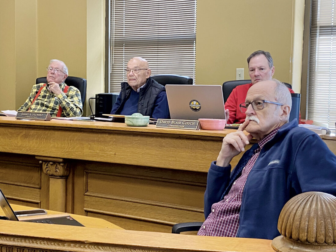 Wood County Commissioners Robert Tebay, Jimmy Colombo and Blair Couch discussed how to best utilize and coordinate heating stations around the area during times of extreme cold with a representative from the United Way Alliance of the Mid-Ohio Valley during Monday’s meeting. (Photo by Brett Dunlap)