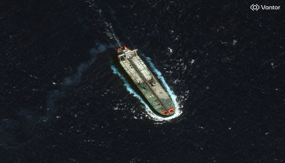The crude oil tanker Skipper recently seized by the U.S. off the coast of Venezuela, seen as the ship was traveling in a southwesterly direction and positioned approximately 33 kilometers north of Guadeloupe, in the southern Caribbean Sea, Dec. 12, 2025. (©2025 Vantor via AP)