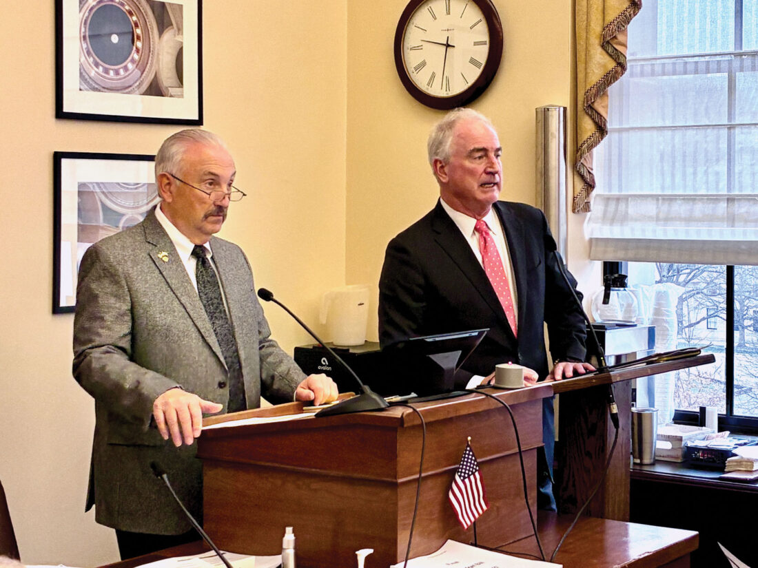 Department of Revenue Secretary Eric Nelson, right, provides an introduction of the department’s budget and revenue reports Thursday before the House Finance Committee Meeting as Chairman Vernon Criss, R-Wood, chairs the meeting. (Photo by Steven Allen Adams)