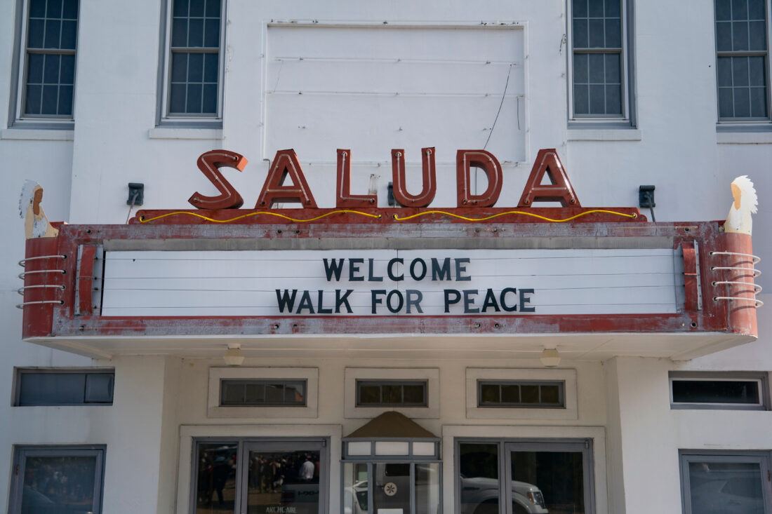 A sign is seen greeting the Buddhist monks who are participating in the, "Walk For Peace," Thursday, Jan. 8, 2026, in Saluda, S.C. (AP Photo/Allison Joyce)