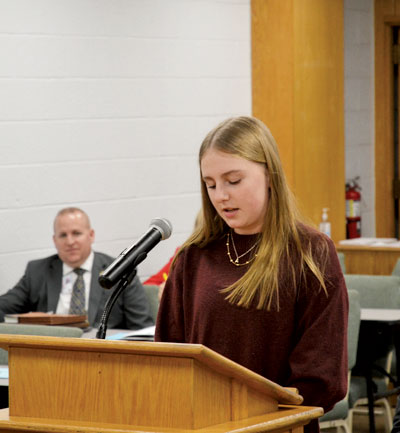 - Aven Pifer, an eighth-grader at Edison Middle School, speaks to the Wood County Board of Education Tuesday night. Pifer is part of the Student Advisory Council where students from throughout the district can voice their concerns about events, about their facilities, and their experience as students. (Photo by Douglass Huxley)