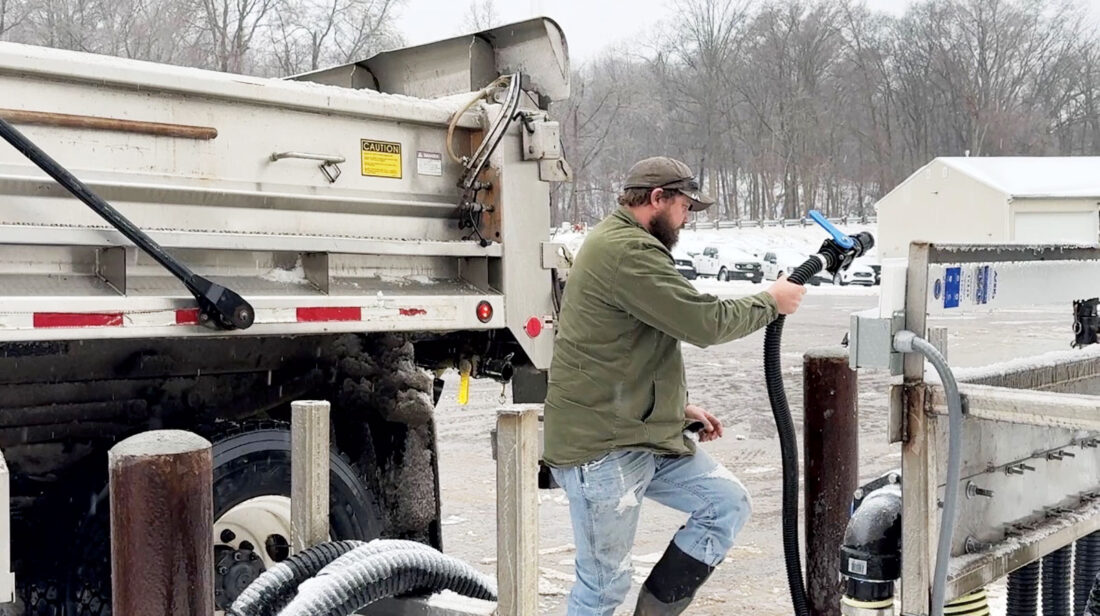 Ohio Department of Transportation Highway Technician Travis Ball fills his truck with brine Sunday at the Belpre Outpost. Area road crews have been out during the recent snow working to clear local roadways. (Photo Provided)