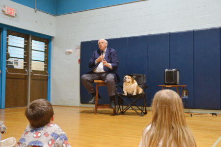 Darlene Murphy, Boys and Girls Clubs of Parkersburg CEO, right, introduces U.S. Sen. Jim Justice and Babydog to the club’s young members Tuesday. Justice talked to the kids about the importance of working hard and dreaming big. (Photo by Douglass Huxley)