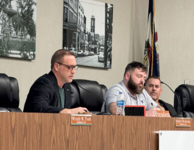 - Parkersburg City Council President Andrew Borkowski, left, speaks during Tuesday’s council meeting as Councilmen Zak Huffman, center, and Mike Reynolds listen.