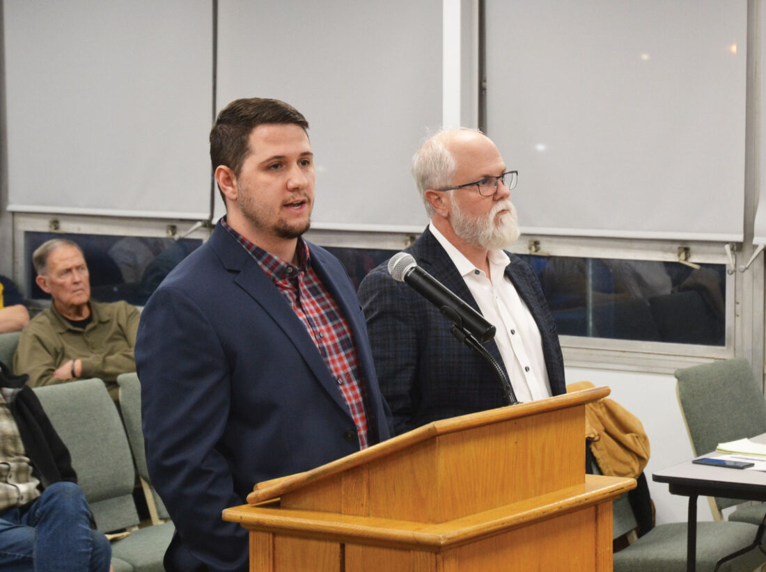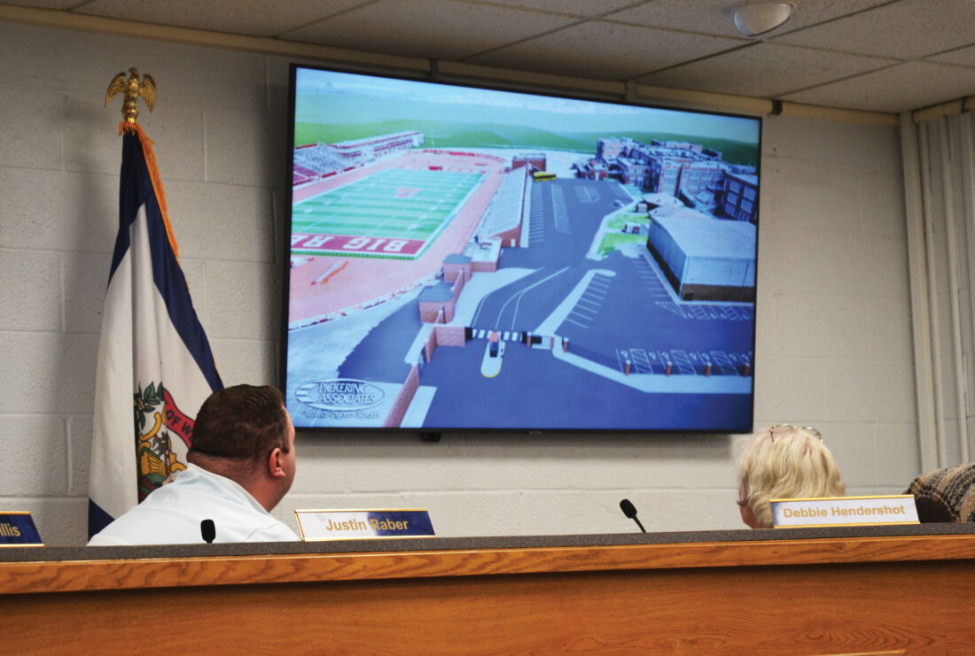 - Sean Cottrill, assistant director of education design for Pickering Associates, and Ryan Taylor, CEO and president, talked to the Wood County Board of Education Tuesday night about renovations to Parkersburg High School’s historic stadium. (Photo by Douglass Huxley)