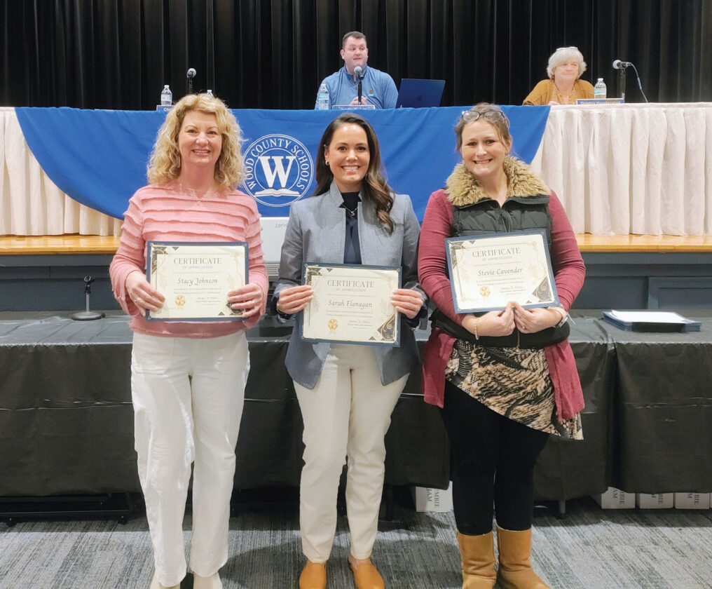 The Wood County Board of Education recognized educators in the district who completed the Wilson Reading System 1 Certification. The lessons train educators to implement intensive, multisensory reading and spelling interventions for students with dyslexia or significant word-level deficits. Pictured from left to right: Stacy Johnson, Sarah Flanagan and Stevie Cavander. The board also heard attendance updates, how the merger with Hamilton and Jackson middle schools is going, and a bond update. (Photo by Douglass Huxley)