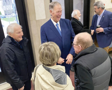 A reception was held Thursday at the Wood County Resiliency Center for Wood County Commissioner Jim Hamric who was sworn into office on Thursday. Hamric talks with some of the people who attended his swearing in during the reception. (Photo by Brett Dunlap)