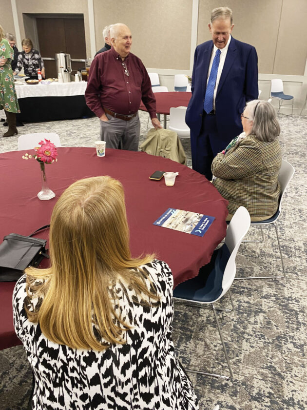 - A reception was held Thursday at the Wood County Resiliency Center for Wood County Commissioner Jim Hamric who was sworn into office on Thursday. Hamric talks with some of the people who attended his swearing in during the reception. (Photo by Brett Dunlap)