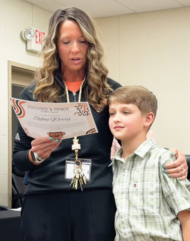 - Marietta Elementary School Principal Brittany Schob presents student Sylas Werry with the monthly Focused and Fierce award during a regular Marietta City Board of Education meeting Monday.(Photo by Amber Phipps)