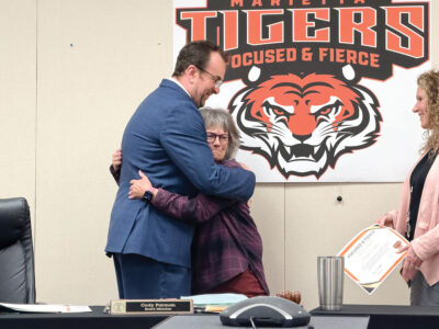 - Marietta City Board of Education member Chris Fennell embraces Focused and Fierce Award winner Tonya Cullen during a regular Board of Education meeting Monday. (Photo by Amber Phipps)