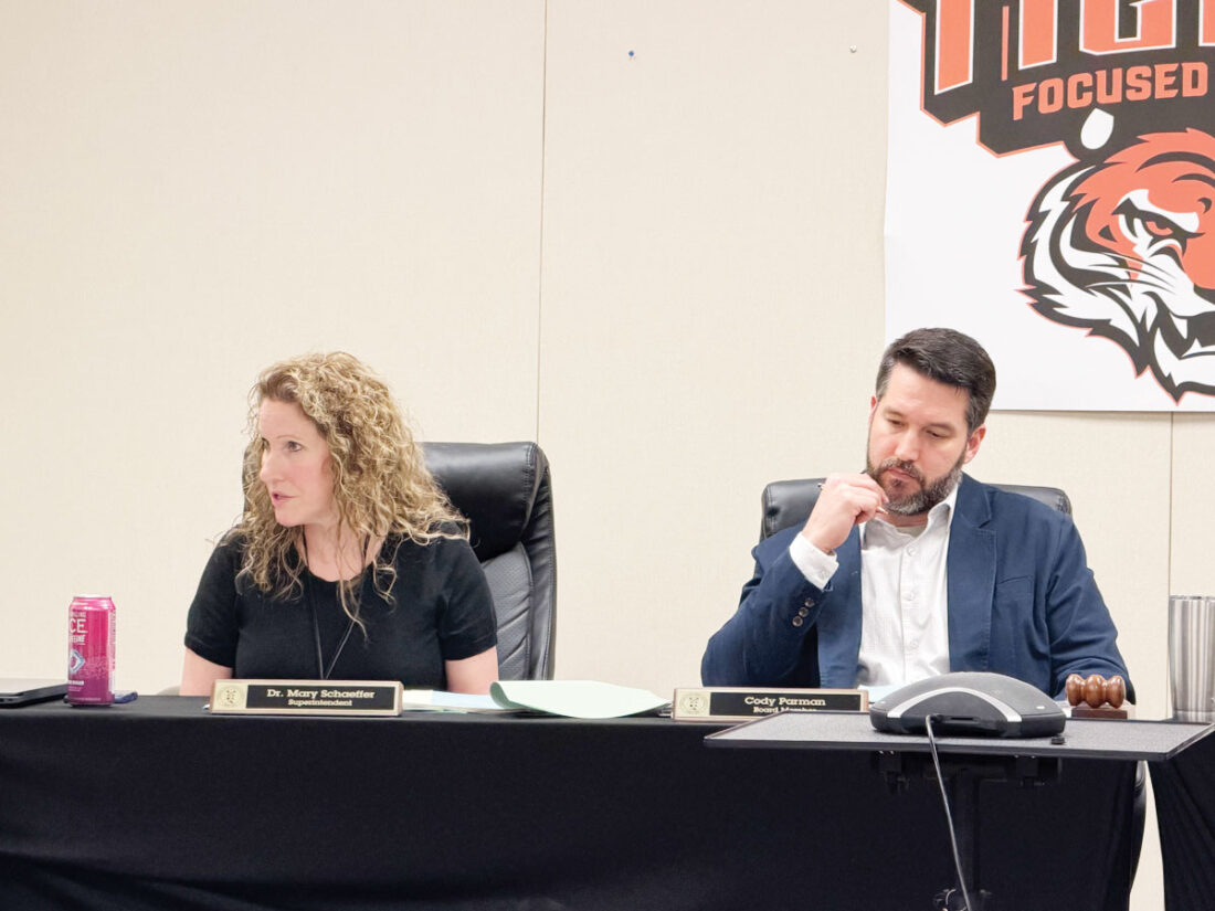 - Marietta City Schools Superintendent Mary Schaeffer, left, shares district updates with board members and the audience as Board of Education President Cody Parman, right, listens during Monday’s board meeting. (Photo by Amber Phipps)