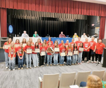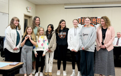 Members of the Marietta Elementary School Student Leadership accept a monetary donation from the Rotary Club of Marietta during a Marietta City Board of Education meeting Monday. (Photo by Amber Phipps)