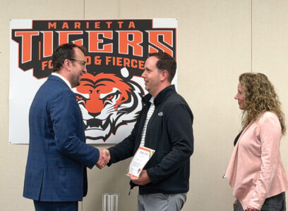 - Marietta City Board of Education member Chris Fennell, left, shakes Steve Brown’s hand, middle, at the regular Board of Education meeting Monday. (Photo by Amber Phipps)