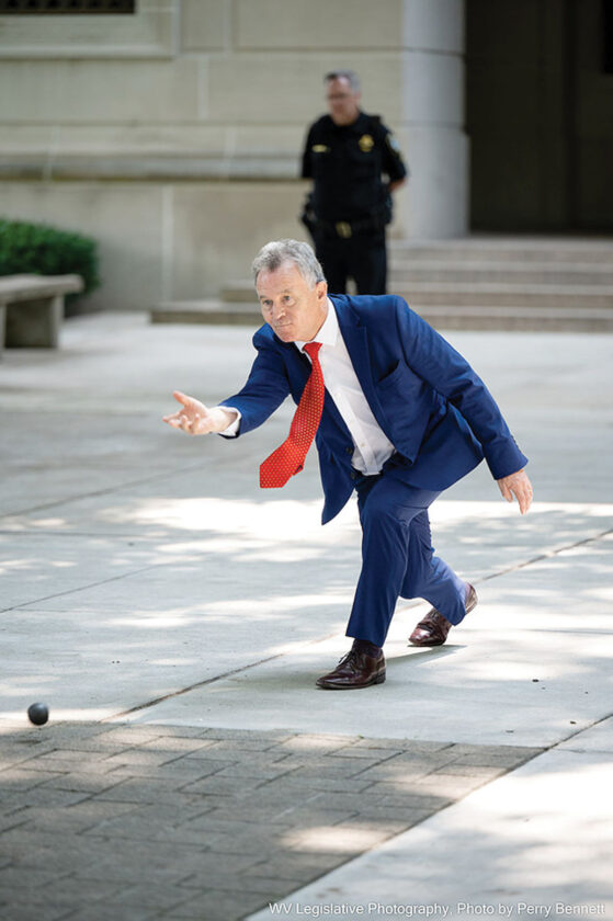 Irish Minister for Diaspora Sean Fleming takes part in Irish road bowling at the State Capitol Building during a June 2023 visit to West Virginia to celebrate the creation that year by the Legislature of the West Virginia-Ireland Trade Commission. (Photo Courtesy/WV Legislative Photography)