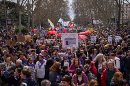 - A woman takes part in an International Women’s Day protest in Madrid, Spain, Sunday, March 8, 2026. (AP Photo/Manu Fernandez)