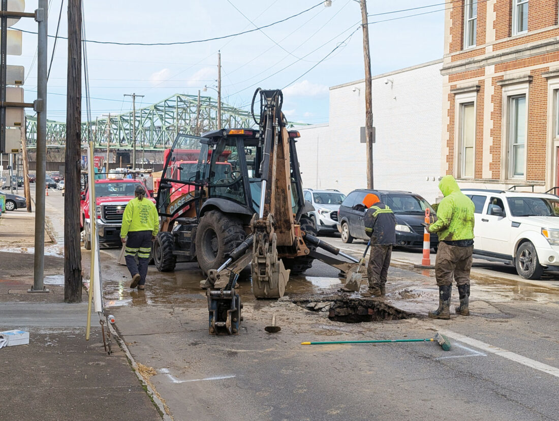 A Parkersburg Utility Board crew wraps up work on a water main repair that closed two lanes on Fourth Street Friday afternoon. That slowed traffic at a time when a power outage apparently caused by the wind made some downtown traffic lights briefly go down. Parkersburg Police reported no significant problems. MonPower reported hundreds of people in Wood County without power Friday afternoon. (Photo by Evan Bevins)