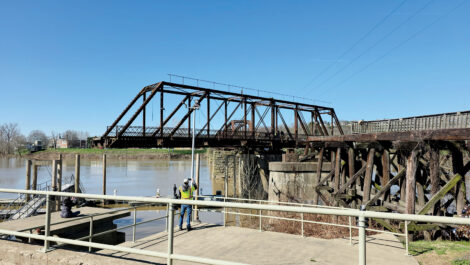 The turning of span 4 – the bridge’s swing span – marked a key moment in the two-day inspection conducted by engineering firm American Structurepoint and its subconsultants. The inspection is intended to guide future decisions on how to rehabilitate the structure and reopen it as a pedestrian connection between Marietta and Harmar Village.