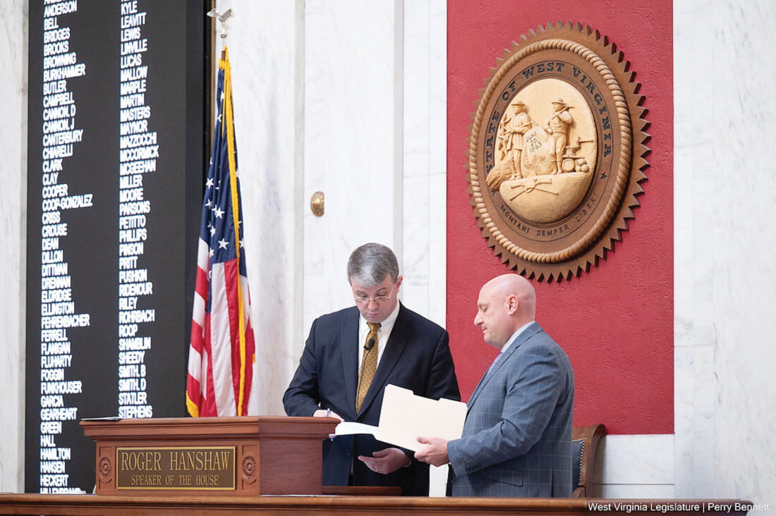 - From left, House Speaker Roger Hanshaw, R-Clay, and House Clerk Jeff Pack go over Thursday’s floor agenda prior to the start of the 9 a.m. session. (Photo courtesy/WV Legislative Photography)
