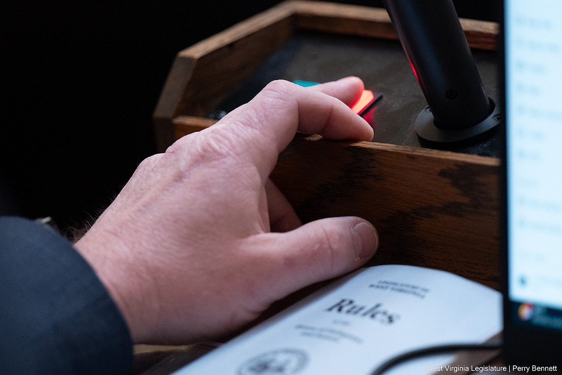 - A member of the West Virginia House of Delegates pushes the red button to vote against a motion Saturday during the final hours of the 2026 legislative session. (Photo courtesy/WV Legislative Photography)