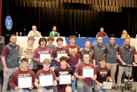 - The Williamstown High School wrestling team was honored by the Wood County Board of Education Tuesday night after finishing as the runners-up in the 79th annual West Virginia State Wrestling Tournament earlier this month. (Photo by Douglass Huxley)