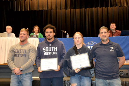 Individuals from the Parkersburg South High School wrestling teams were honored Tuesday night by the Wood County Board of Education for their achievements during the state wrestling meet earlier this month. Pictured are: boys head coach Shaun Smith, Jesse Adams, 190-pound weight class state champion and D1 Most Outstanding Wrestler, Justice Anthony, 114-pound weight class and 4-time state champion and girls’ coach Dustin Anthony. (Photo by Douglass Huxley)