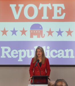 Ohio State Sen. Kristina Roegner, R-Hudson, spoke to people gathered at the Tower Event and Conference Center in Marietta Tuesday for the Washington County Republican Party's annual Lincoln Day Dinner. Roegner is running for state treasurer and faces Jay Edwards in the GOP primary. (Photo by Douglass Huxley)