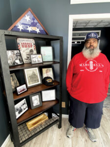 - Marchell Jones Jr. at his business Marchell’s Barbershop in Parkersburg. The business was named as West Virginia Family-Owned Small Business of the Year by the U.S. Small Business Administration’s West Virginia District Office. The shop includes a tribute to his father, Marchell Sr., who had worked as a barber since 1951 and who served in the U.S. Army as a medic in World War II in the Pacific, serving on Okinawa. (Photo by Brett Dunlap)