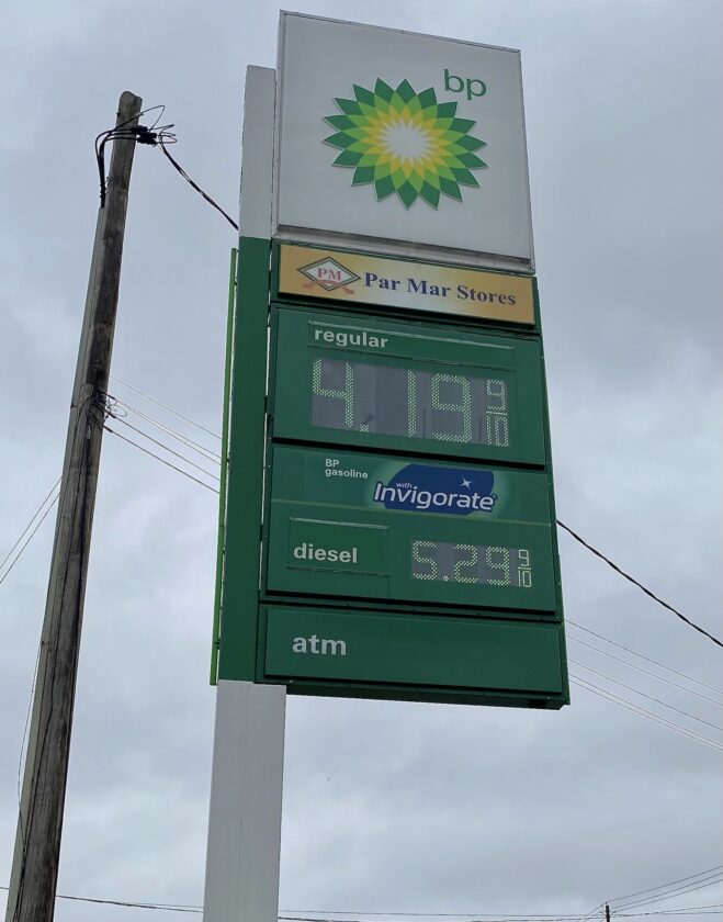 Gas stations in Wood County, W.Va. and Washington County, Ohio saw prices ranging from $4.19 to $4.29 on Tuesday. This Par Mar store on Division Street went from $3.99 to $4.19 on Tuesday. (Photo by Brett Dunlap)