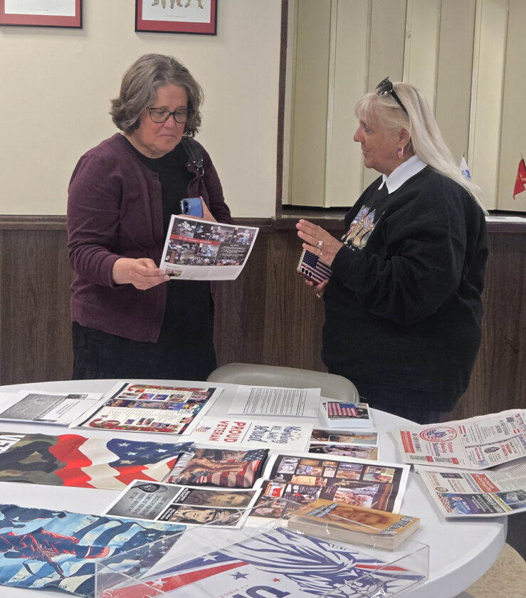 From left, Beth Johnson, executive director of Honor Flight Columbus, listens to Barbara Smith share stories regarding different veteran initiatives in Ohio. (Photo by Gwen Sour)