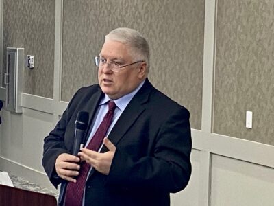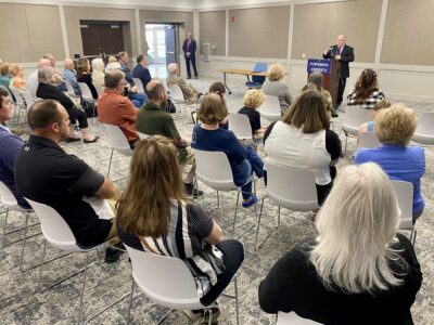 West Virginia Gov. Patrick Morrisey was in Parkersburg Thursday at the Wood County Resiliency Center talking to community leaders about plans to use the state’s energy resources to create economic development and jobs. (Photo by Brett Dunlap)