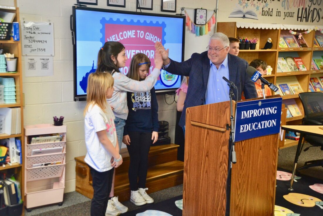 West Virginia Governor Patrick Morrisey gives high-fives to some of the students at Gihon Elementary School in Parkersburg on Monday as he was there for a ceremonial signing of HB 5438 which will provide resources to help fund education initiatives that will help students improve reading and other skills. (Photo by Brett Dunlap)