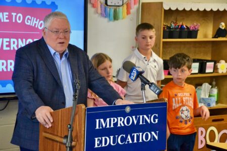 The governor appeared with a number of students from Gihon, with a number of local educators and elected officials in the audience.