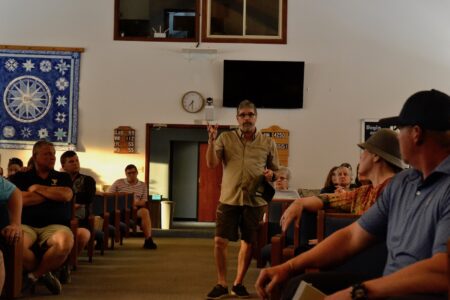 North Hills City Councilman David Cook explains to a crowd gathered at the 36th Street Church of Christ in Vienna that he has concerns that a damaged wall could be a hazard to kids if they voted to open the community swimming pool for the summer. (Photo by Douglass Huxley)