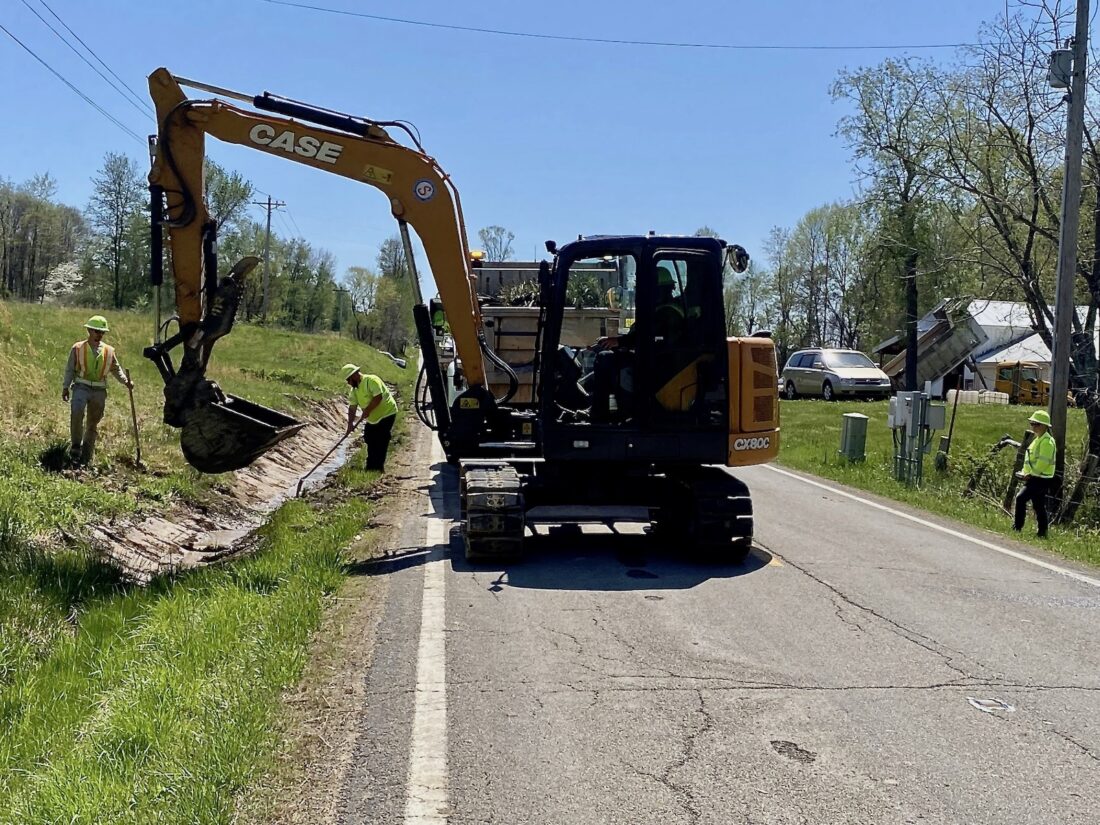 - Work crews with the Ohio Department of Transportation work along Ohio 555 near Bartlett, Ohio Tuesday. This is National Work Zone Awareness Week and drivers are being reminded to be mindful of crews doing work along area roadways. (Photo by Brett Dunlap)