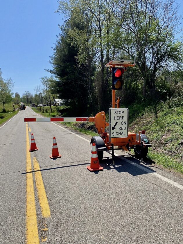 A traffic signal put out by road crews doing work Tuesday along Ohio 555 to better control traffic in highway work zones. This is National Work Zone Awareness Week and people are being asked to remember the safety of highway workers as they drive through work zones. (Photo by Brett Dunlap)