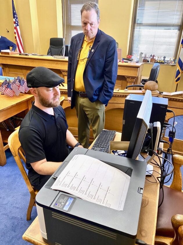 Wood County Commission President Blair Couch, standing, looks on as Wood County IT Director Chris Whittaker conducts a test of the county’s voting systems. Early voting will start Wednesday at the Judge Black Annex in Parkersburg. (Photo by Brett Dunlap)