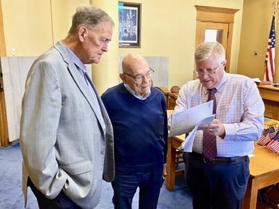 Wood County Commissioners Jim Hamric and Jimmy Colombo went over registered voter numbers Monday with County Clerk Joe Gonzales as the Commission oversaw testing of the county’s voting systems. Early voting starts Wednesday at the Judge Black Annex in Parkersburg. (Photo by Brett Dunlap)