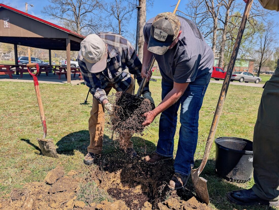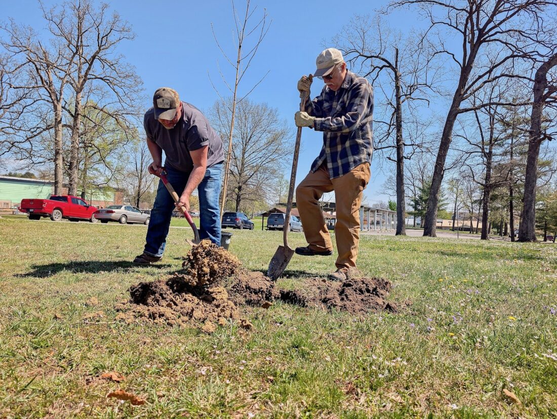 - Parkersburg Tree Commission members Stacey Robinson, left, and John A. Sheets dig a hole for a yellow poplar tree to be planted as part of the city’s Arbor Day observance Friday at City Park. (Photo by Evan Bevins)