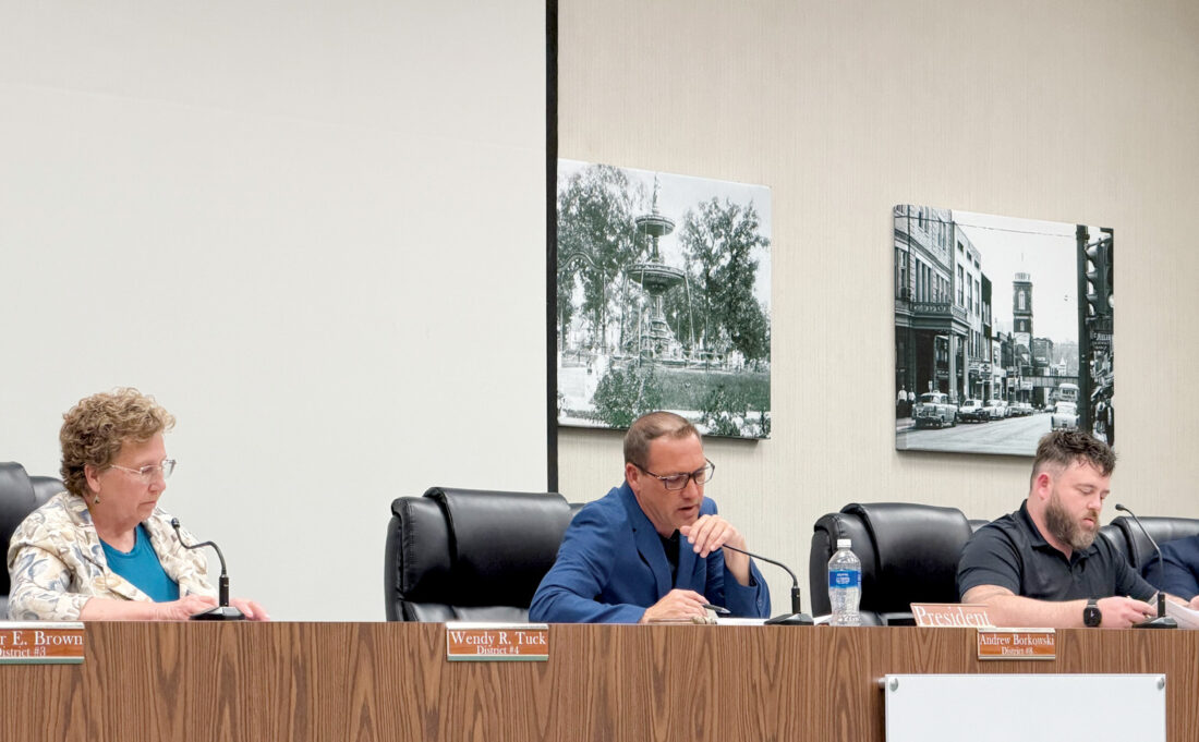 Parkersburg City Council President Andrew Borkowski, center, responds to an update from Finance Committee Chairman Roger Brown, not pictured, during Tuesday’s council meeting as Councilwoman Wendy Tuck, left, and Councilman Zak Huffman listen. The Finance Committee met prior to the regular council session and voted to refer proposed budget revisions to the full council for approval. The revisions included $280,025 to the streets fund and $140,000 to capital reserve for a fountain in the City Park pond, work on Pappas Plaza and additional length on the sidewalks in the park. The meeting was still going on at deadline. Read more online at NewsandSentinel.com and in Thursday’s print edition.