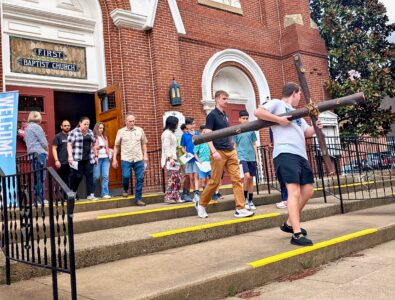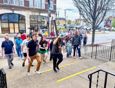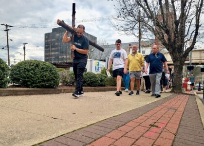 - Vienna resident Zach Uppole carries the cross as the Good Friday Community Stations of the Cross walk departs First Baptist Church in downtown Parkersburg on Friday. Nearly 100 people participated in the annual interdenominational procession between downtown churches in memory of Jesus Christ’s crucifixion ahead of Easter Sunday. (Photo by Evan Bevins)