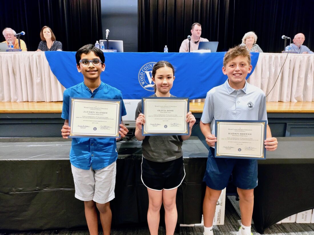 The Wood County Board of Education recognized Jayden Mathew, Olivia Rose and Raiden Brewer as the middle school winners of the West Virginia State Science Fair Tuesday at Jefferson Elementary. The board also recognized students from throughout the district for their accomplishments in choir and band. There were also updates on excess material from the new Lubeck Elementary, a presentation on concussion testing from WVU Medicine, and federal programs and special education updates. Read more about Tuesday's meeting online and in the Thursday edition of the News and Sentinel. (Photo by Douglass Huxley)