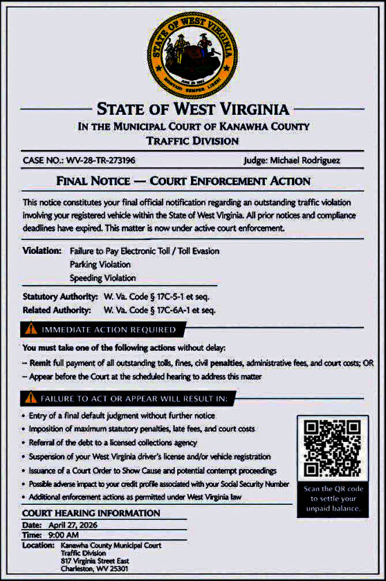 At least one Wood County resident reported she received the official-looking text message that said she owed a fine in the Kanawha County Municipal Court and the message was a final notice for court enforcement. The notice using the seal of the state of West Virginia also contained a QR code to be scanned to settle the unpaid balance.