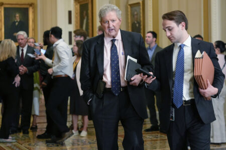- Sen. John Kennedy, R-La., center, speaks with a reporter, Tuesday, April 14, 2026, in Washington. (AP Photo/Mariam Zuhaib)
