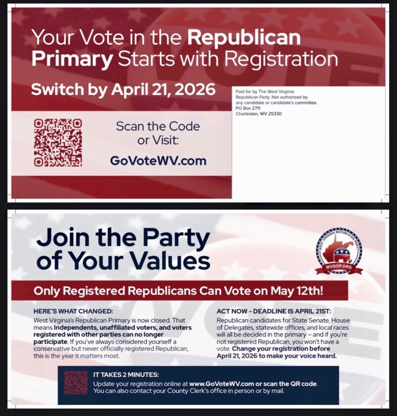 CHARLESTON – With less than 23 days left before the May 12 party primary election and today the deadline to register to vote, the West Virginia Republican Party is defending a recent mailer that state Democratic Party officials called “misleading.” The state Republican Party sent out a mailer to voters last week reminding them that only registered Republicans can vote in the May GOP primary. The front side of the mailer states that “Your Vote in the Republican Primary Starts with Registration.” The headline of the back side of the mailer states, “Join the Party of Your Values,” with the sub-headline reading, “Only Registered Republicans Can Vote on May 12th!” Today is the last day for residents to register to vote or update their voter registration information to participate in the May primaries. Voters can either visit their local county clerk’s office today during business hours to register or update registration, or update their registration by midnight by visiting the Secretary of State’s election website at GoVoteWV.com. More than two years ago, members of the West Virginia Republican Executive Committee voted for an amended resolution to close the Republican primary to unaffiliated voters beginning in 2026 after an attempt to close the 2024 GOP primary failed. “West Virginia’s Republican Primary is now closed,” according to the text of the mailer. “That means independents, unaffiliated voters, and voters registered with other parties can no longer participate. If you’ve always considered yourself a conservative but never officially registered Republican, this is the year it matters most.” “The West Virginia Republican Party has been clear and consistent since the 2024 decision to close the primary: If you want to participate in the Republican primary, we want you to and here’s how to do it,” said Del. Josh Holstein, chairman of the West Virginia Republican Party, in a statement Monday afternoon. “That message has been communicated through earned media, text outreach, social media and direct mail,” said Holstein, R-Boone. “Some efforts are broad, reaching all voters, while others are more targeted, focusing on individuals our data shows have participated in Republican primaries but are not currently registered as Republicans.” However, voters unaffiliated with any political party can still request a Democratic primary ballot or vote in nonpartisan races during the May primary. Del. Mike Pushkin, the chairman of the West Virginia Democratic Party, said in a statement Monday that the party is filing an election complaint over the GOP mailer with the Secretary of State’s Office. “This mailer is deliberately deceptive,” said Pushkin, D-Kanawha. “That headline is designed to trick voters, particularly independents, into believing they cannot vote at all in the May 12 primary. That is simply not true. “The Republican Party made a conscious decision to shut independents out of their primary,” he continued. “Now they’re compounding that by sending out mailers designed to suppress voter participation.” Holstein said any accusations that the Republican Party was trying to engage in voter suppression ahead of the state primary voter registration deadline are “ridiculous.” “Claims of voter suppression are ridiculous and unserious, particularly when the purpose of this effort is to ensure that every voter who wants to participate in the Republican primary understands the process and has the opportunity to do so,” Holstein said. “The mailer specifically and boldly refers to the Republican Primary election on both the front and back of the mail piece, and any attempt to extrapolate otherwise is just embarrassing. Democrats, once again, are trying to blame everyone but their own failed leadership for their downward spiral.” Donald “Deak” Kersey, the chief of staff to Secretary of State Kris Warner, could not confirm nor deny whether any election complaints had been filed regarding the mailer. He encouraged the public to get their election information from local county clerks or through the Secretary of State’s Office at GoVoteWV.com. “State law is mostly silent on the Secretary of State’s authority to weigh in or regulate speech by political parties and candidates except where the speech expressly advocates for or against a candidate,” Kersey said. “Where a political message has the correct information, but it’s a matter of reading the entire message for material context, the law does not give the Secretary of State’s Office any direction or discretion to seek remedial action.” Early voting for the May 12 primary runs April 29 through May 9, excluding Sundays, at county courthouses or designated voting locations. Steven Allen Adams can be reached at sadams@newsandsentinel.com.