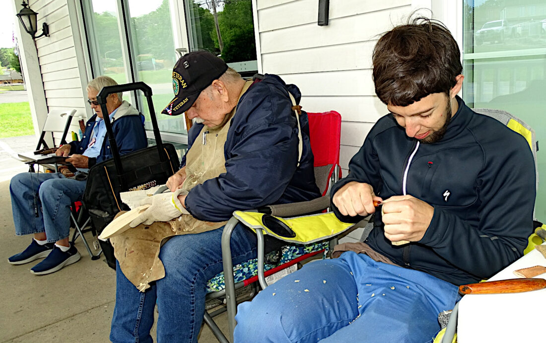 - From left, Larry Hershman, Paul Bowers and Keven Hilty, members of the Geppetto Woodcarvers in a past Carving on the Porch at Woodcraft where the hobby is explained and work is displayed. This year’s event will be from 10 a.m. to 3 p.m. Saturday at Woodcraft. (Photo Provided)