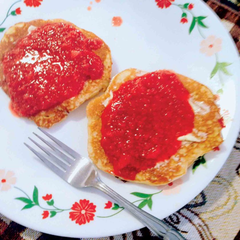 Pancakes with Mixed Berry-Honey Sauce make a good breakfast or dinner anytime! (Photo by Amy Phelps)
